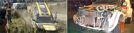 Los mecánicos desmontaron la parte delantera del coche y aquello era un desastre, un amasijo de componentes, el capó de chapa estaba arrugadísimo y había mucho que reparar. Ya entrada la madrugada, los mecánicos me mandaron a dormir porque al día siguiente había más de 800 km a recorrer. Mientras que Campoy se ocupaba del camión T4, Jorgito y Jesús intentaban arreglar aquello con el recambio que había en el camión T5. Cuando me levanté por lo mañana, no podía creer el estado tan perfecto en que habían dejado el coche. Allí estaba listo para salir a la 2ª etapa, habían hecho una obra de arte, incluido la reparación del capó que se había encargado Isidro, quedaba algún detalle en la fijación del intercooler que Jesús me lo ató bien con una eslinga cruzada, tan bien, tan bien que así llegaría a meta 12 días después.